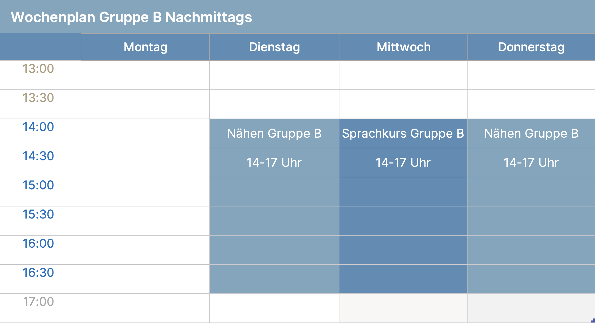 Gruppe B trifft sich am Nachmittag von 14-17 Uhr. Du kannst dich für einen der zwei Wochenpläne entscheiden: